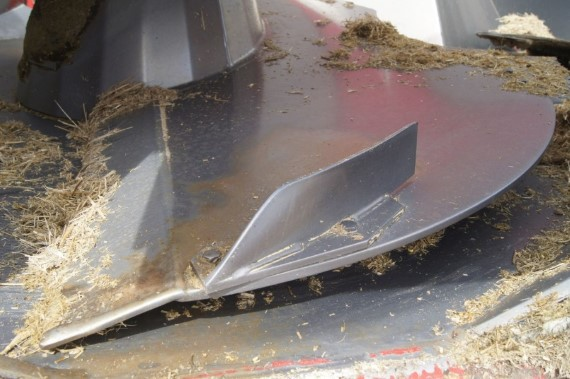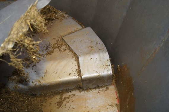 Mange foderblandere har vanskeligt ved at flytte tunge findelte rationer uden ekstraudstyr. Vær derfor altid meget opmærksom på, om der er et tilstrækkeligt flow i foderblanderen, og særligt om flowet er opretholdt sidst i blandeprocessen. Figur 1 viser to forskellige eksempler på eftermonterede hjælpeforanstaltninger med det formål at sikre flowet i blanderne. Figur 1a viser en effekt-plade monteret på Kongskilde (JF-Stoll), og Figur 1b viser et snegleskær på en BVL-blander.
