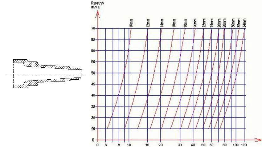 Billedet til venstre viser diagram for konisk dyse. Til højre ses diagram over dyseydelser for koniske dyser (kastedyser) - uden ensrettere i selve dysen.