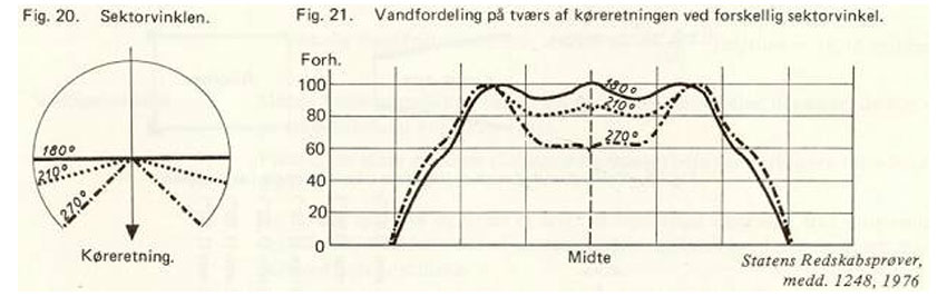 Maskiner med turbine: Ifølge forsøg på Statens Redskabsprøver (i dag Danmarks JordbrugsForskning, Forskningscenter Bygholm) i 1976, er sektorvinkelen for den optimale vandfordeling 180° - som vist på diagrammet nedenfor. Diagrammet gælder for maskine med turbine.