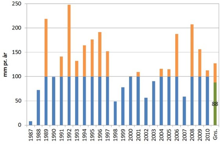 Figur 2. Vandforbrug (blå søjler) i gennemsnit for vandede arealer med grovsandet jord 1987-2010, hvis der vandes i forhold til vandingsbehov og en indvindingstilladelse på 100 mm pr. år, mm. I gennemsnit vandes der maksimalt med 88 mm. De orange søjler angiver det vandingsbehov, der ikke kan dækkes, når indvindingstilladelsen er 100 mm.