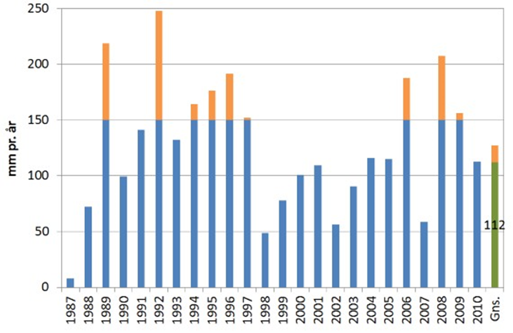 I figur 1 er vist det beregnede vandingsbehov på grovsandet jord med en rodzonekapacitet på 60 mm for perioden 1987-2010 i det gamle Ribe amt, dvs. der er anvendt klimadata for den pågældende periode og der er taget udgangspunkt i afgrødesammensætningen på vandede arealer. Det er vurderet, at græs og kløvergræs udgør ca. en tredjedel af det vandede areal. Det fremgår af figuren, at vandingsbehovet varierer meget fra år til år afhængig af især nedbøren i vækstsæsonen. Det gennemsnitlige vandingsbehov for hele perioden er 127 mm.
