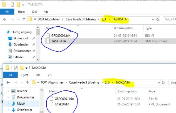 Figur 6. Som det ses er her to ISOXML tildelingsfiler for markerne 2_0 og 2_1 (gul farve). Med blå cirkel er vist at selve tildelingsfilen i begge tilfælde hedder TASKDATA. Det er altså ikke muligt via filnavnet at se hvilken fil, der hører til hvilken mark. Det er derfor nødvendigt at lave en mappe struktur på USB stikket med Mark 2_0 og Mark 2_1.