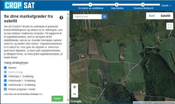 Figur 2. På CropSAT.dk kan du i venstre side vælge forskellige strategityper. Her klikker du på ”Protein prognose i hvede”.