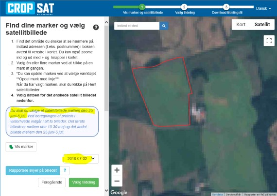 Figur 3. For at beregne protein prognosen skal du vælge et satellitbillede der ligger mellem d. 25. juni – 5. juli. Her er valgt d. 2. juli. Hvis der ikke er skyer på billedet på den valgte dato trykkers på ”Vælg tildeling”. Er der skyer vælges en anden dato indenfor dato intervallet.