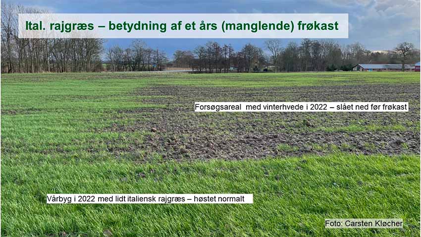 Billede 1. Et eksempel på, at det kan have endog meget stor effekt at undgå frøkast af græsukrudt. I området med mindst italiensk rajgræs har der året før været et forsøg i vinterhvede, som er afsluttet med at fjerne ukrudt og afgrøde før frøkast. I den omgivende mark har der i 2022 været vårbyg, hvor der var lidt italiensk rajgræs. Billedet er fra januar 2023. Foto: Carsten Kløcher, Djursland Landboforening.