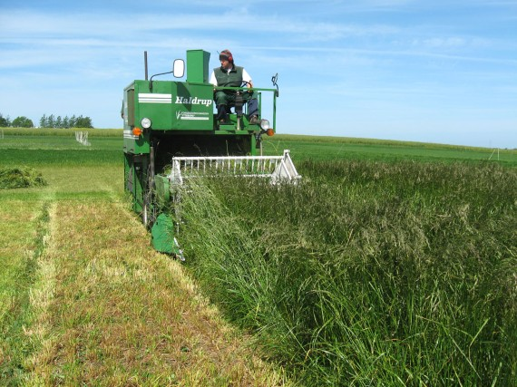 Billede 1. Høst af første slæt i en 3-slætsstrategi med rajsvingelblandinger. Ytteborg, 2/6 2009. (Foto: Søren Ugilt Larsen).