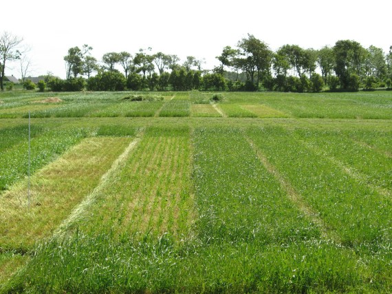 Billede 2. Forsøg med varieret tidspunkt for 1. slæt i en 3-slætsstrategi. Første slæt er høstet hhv. (fra venstre) 2. juni, 25. maj, 12. maj og 18. maj. Ytteborg, 2/6 2009. (Foto: Søren Ugilt Larsen).
