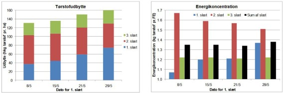 Figur 2 viser, hvordan tørstofudbyttet i 1. slæt stiger meget ved at udskyde høsttidspunktet op til 3 uger, mens tørstofudbyttet i 2. slæt kun falder moderat, og derfor er det samlede udbytte øget med næsten 3 tons tørstof/ha. Figur 2 viser også, hvordan kvaliteten ændres afhængig af slættidspunkt. Ved at udskyde tidspunktet for 1. slæt falder energikoncentrationen i græsset i 1. slæt (dvs. der skal mere tørstof til en foderenhed), mens energikoncentrationen stiger i 2. slæt. Den gennemsnitlige energikoncentration for summen af de 3 slæt er dog stort set konstant uanset slættidspunktet for 1. slæt.