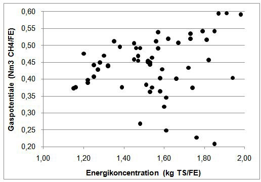 Sammenhængen mellem gaspotentiale og foderværdi er i figur 1 belyst for 56 græsprøver fra 3 markforsøg gennemført i 2008. Prøverne repræsenterer 2 forskellige sorter af rajsvingel enten i renbestand eller i blanding med rødkløver, og der er enten høstet 2 eller slæt pr. år. Især pga. de forskellige slætstrategier er der meget stor forskel på græssets beskaffenhed, og det kommer til udtryk i den store variation i både i energikoncentration (1,15-1,98 kg TS/FE) og gaspotentiale (118-440 Nm3 CH4/ton org. TS). Figuren viser, at der ikke er nogen entydig sammenhæng mellem energikoncentration og gaspotentiale, og især er der stor variation blandt prøverne af tungt fordøjeligt græs med lav energikoncentration, dvs. prøver hvor der skal mere tørstof til en foderenhed. Derfor er det ikke optimalt at beregne gaspotentialet ud fra energikoncentrationen til foderbrug, og ideelt set er det ønskeligt at have egentlige analyser af gaspotentialet i forskellige slags græs til biogas. I mangel af disse analyser eller andre måleparametre kan foderværdien dog fungere som en indikator for gaspotentiale i græs. For de 56 målinger i figur 1 varierer gaspotentialet fra 0,21 til 0,60 Nm3 CH4/FE med et gennemsnit på 0,44 Nm3 CH4/FE. Da analyserne er udført ved meget længere udrådningstid (90 dage) end en normal opholdstid i danske biogasanlæg, bør der som minimum trækkes 10 pct. fra det analyserede gaspotentiale. Som en grov tommelfingerregel kan der derfor forventes et realiserbart gaspotentiale på ca. 0,4 Nm3 CH4/FE ved anvendelse af græs. For tungt fordøjeligt græs er omregningen som vist mindre sikker, men der kan muligvis være en tendens til højere gaspotentiale pr. FE.