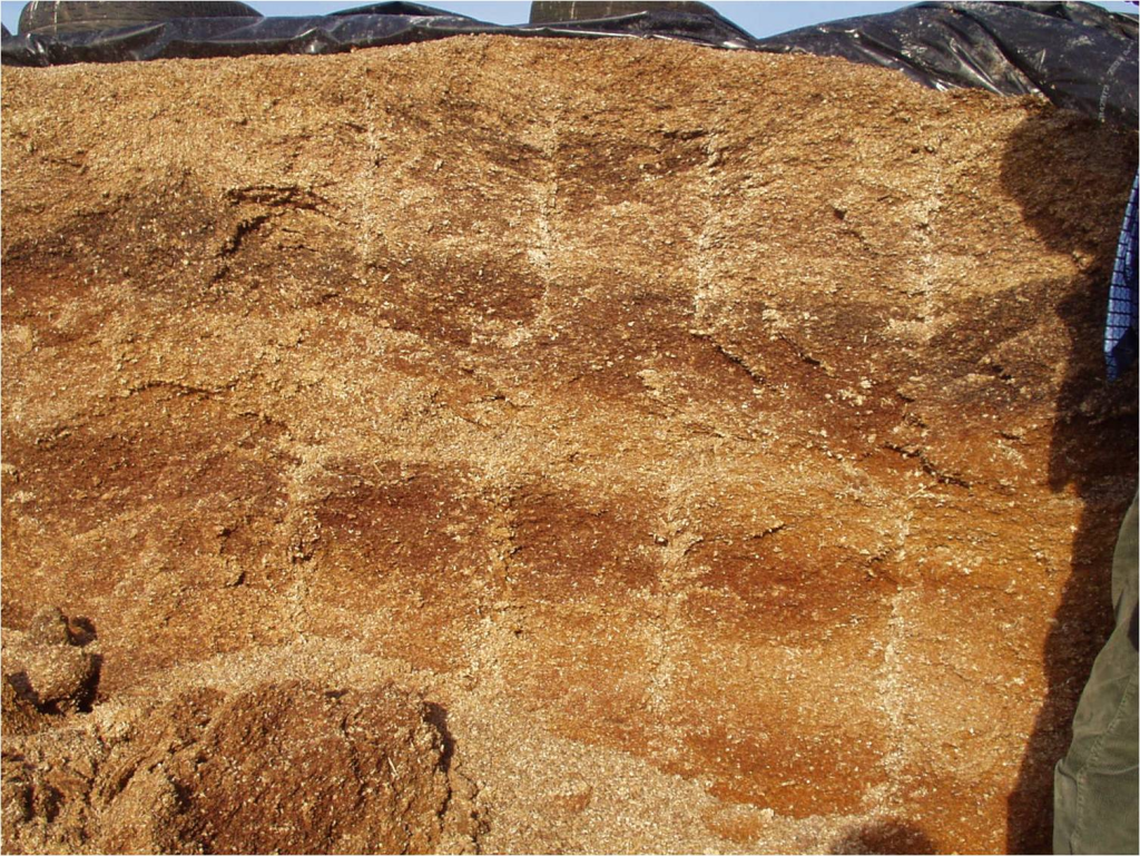 Billede 1. Crimpet korn i plansilo. Det crimpede, ensilerede korn er meget kompakt. Normalt kan man regne med cirka ét ton crimpet korn pr. kubikmeter. Det anbefales, at siloen ikke er for bred, så der sikres mindst 20 cm fremdrift pr. dag i siloen for at undgå varmedannelse. Foto: Jens Møller.