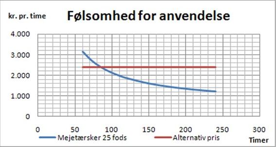 Figur 1. Eksempel på grafisk følsomhedsanalyse med angivelse af en mulig alternativpris. Skal mejetærskeren i eksemplet her køre mindre end 80 timer, er økonomien i alternativet bedre. Ved brug over 80 timer pr. år kan investeringen være attraktiv – afhængigt af, hvordan de øvrige forudsætninger udvikler sig.