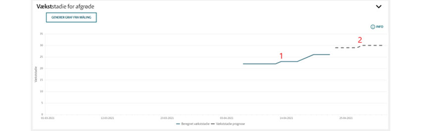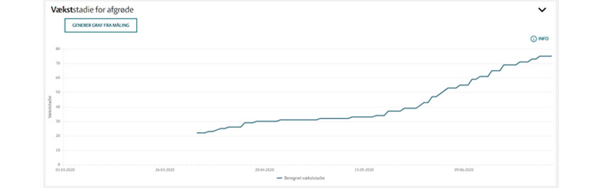 I CropManager vises vækststadieudviklingen beregnet ved en model, der bygger på data fra Registreringsnettet. Modellen simulerer udviklingen fra vækststadie 21, 22 eller 23 og op til stadie 75 udelukkende på baggrund af døgnmiddeltemperaturen, baseret på lokale vejrdata fra DMI. Hvert år startes modellen op tilpasset de enkelte landsdele ud fra lokale observationer af det aktuelle vækststadie efter vinteren. Læs mere i artiklen: Vækststadiemodel for vinterhvede.