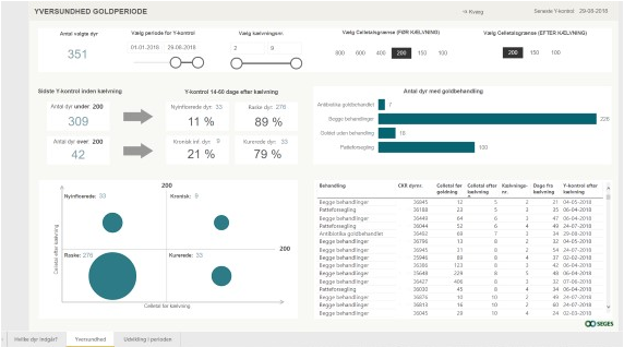 Analyseværktøjet Yversundhed i goldperioden kan med andre ord bruges til at finde de rigtige dyr til den rigtige managementprocedure – og til at rette ind, hvis strategien ikke fungerer som ventet. Det er desuden muligt på besætningsniveau at indsætte celletalsgrænser – dvs. når køerne ligger i dette interval, skal jeg gøre dette. Fx op til 100.000 giver vi patteforsegler – fra 100.000 - 400.000 både patteforsegler og antibiotika, hvis vi har en mælkeprøve, som er positiv for en bakterie, vi vil behandle mod.