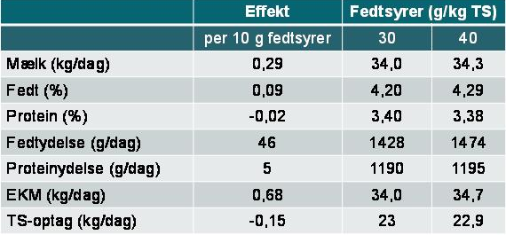 Beskyttet fedt i form af mættet og calciumforsæbet fedt øger begge fedtydelsen signifikant med hhv. 46 og 50 g pr 10 g ekstra fedtsyrer. Virkningsmekanismen er forskellig, idet calciumforsæbet fedt øger mælkemængden, mens mættet fedt øger mælkens fedtindhold. Calciumforsæbet fedt medfører en markant reduceret foderoptagelse. Med den høje fedtafregning fra mejeriet p.t., er det aktuelt at regne på økonomien i brugen af beskyttet fedt.