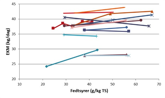 Responser fundet i nærværende undersøgelse svarer rimeligvis til de effekter der blev fundet i ældre dansk arbejde fra 90erne (Danske Fodernormer, 1999), og som er som var baseret på forsøg med især animalsk fedt fra 1960’erne til 1980’erne.