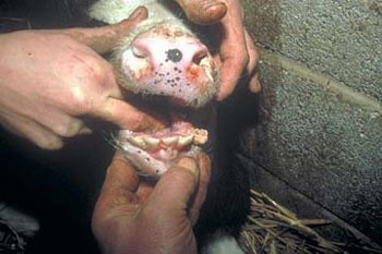 Persistent inficeret (PI) dyr med små sår i mundhulen og på næse, tunge og læber.