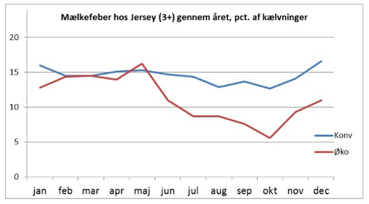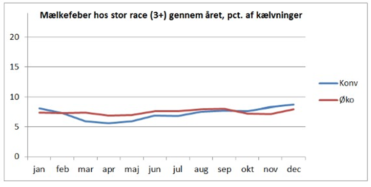 Figuren viser tendens til en højere forekomst af mælkefeber om vinteren end om sommeren hos konventionelle køer. De økologiske køer får derimod mælkefeber i syv til otte procent af kælvningerne uanset tid på året.
