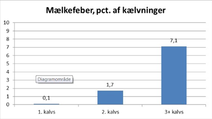Figuren viser, at næsten ingen første kalvs køer får mælkefeber, mens niveauet er på godt syv procent hos ældre køer. Forklaringen er sandsynligvis, at køernes calciumpulje (knoglerne) er mindre labil med alderen, og at en højere ydelse trækker relativt stærkere på calcium-puljen hos de ældre køer.