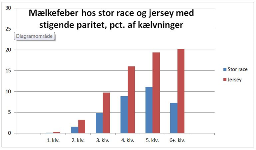 Figur 2. Forekomst af mælkefeber hos stor race og jersey opdelt per paritet.