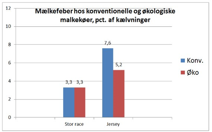 Andelen af stor race med mælkefeber ligger på 3,3 pct. uanset produktionsform, mens økologiske Jersey ligger med en forekomst, som er godt to enheder lavere end konventionelle Jersey.