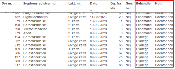 Der har været et stort ønske om at kunne se om det er landmand eller dyrlæge, der har behandlet dyret. Den information er nu tilgængelig i tabellen på sundhedsanalyse, køer. På samme måde har der været et stort ønske om at se hvilket hold dyrene står i, når der registreres sygdomme.