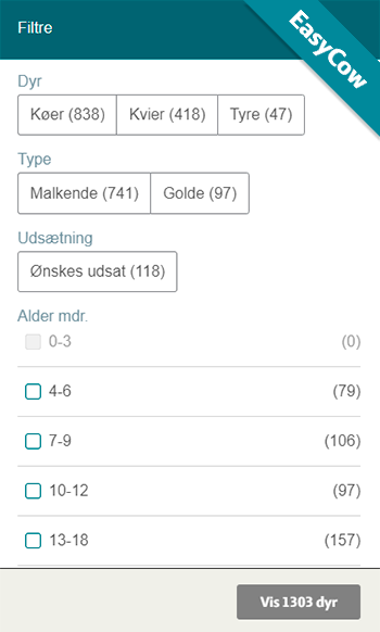 I EasyCow er der kommet "Filtre" under "Find dyr" Her kan du se antal dyr i bestemte grupperinger fx antal malkende og golde. Du kan også aktivere filtrene og på den måde kan fremsøge f.eks. kvier i en bestemt aldersgruppe eller alle goldkøer og herefter bladre de udvalgte dyrs ko-kort igennem.