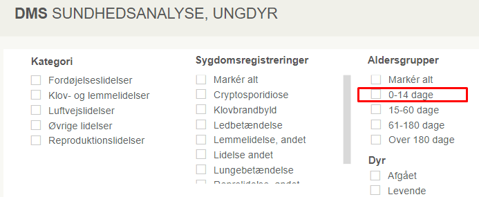 Der har været flere ønsker om at kunne analysere samlet på alle sygdomsregistreringer på kalve og ungdyr. Derfor er dag 0 nu inkluderet i den aldersgruppe, der hedder 0-14 dg på begge analyser: