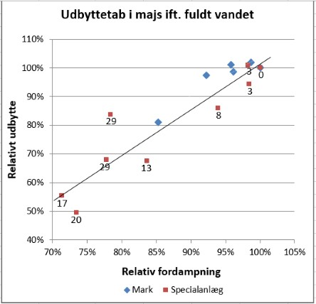 Figur 1. Relativt udbytte af majs i tørkestressede behandlinger i forhold til fuldt vandet som funktion af den relative fordampning i både specialanlæg og markforsøg. Tallene viser antal dage, hvor jordvandsunderskuddet har været større end 45 mm i de forskellige forsøgsled.