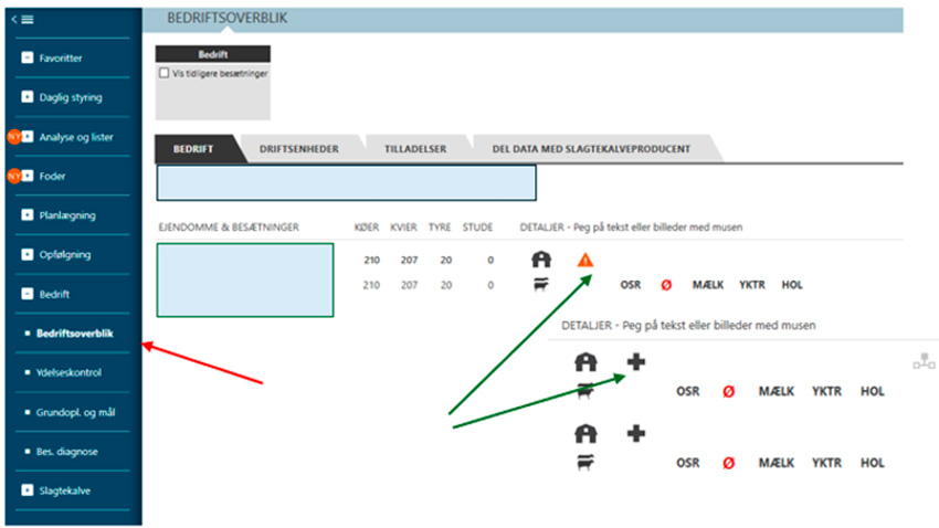 Under fanen Bedriftsoverblik kan du komme videre til Fanen Sundhed. For at komme videre skal du trykke på den orange trekant eller det sorte plus (grønne pile). Hermed kommer du over i Sundhedsfanen.